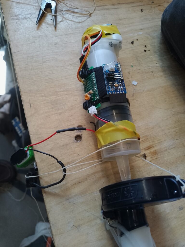 Projektin toinen vaihe oli rajoittimen kasaaminen. Rajoitinta tarvitaan siihen, että servo, joka siirtää painolastia (vettä) sisään ja ulos liitimestä, ei ylirasita itseään, kun maksimi painolastille on saavutettu. Rajoittimeen tarvittiin yksinkertainen kytkin ja hieman johtoja.